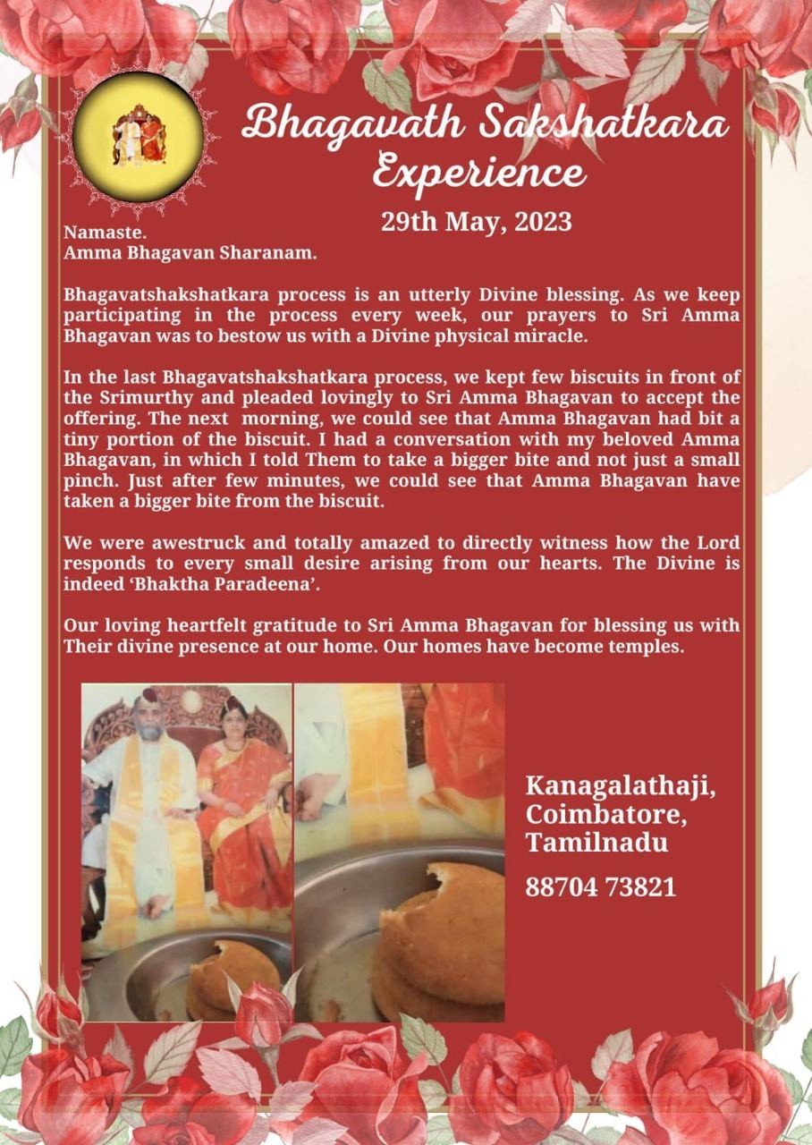 前回のバガヴァット・サクシャッカーラのプロセスでは、シュリムリティの前に数枚のビスケットを置き、どうかシュリ・アンマ・バガヴァンがその供物を受け入れてくださるよう、愛情を持って懇願しました。