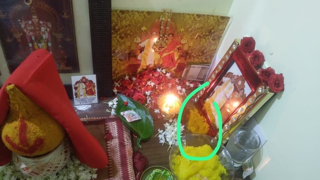 今日、シュリ・アンマ・バガヴァンのシュリムルティの前に、ソーマとしてウコンの粉の顕現をいただきました。