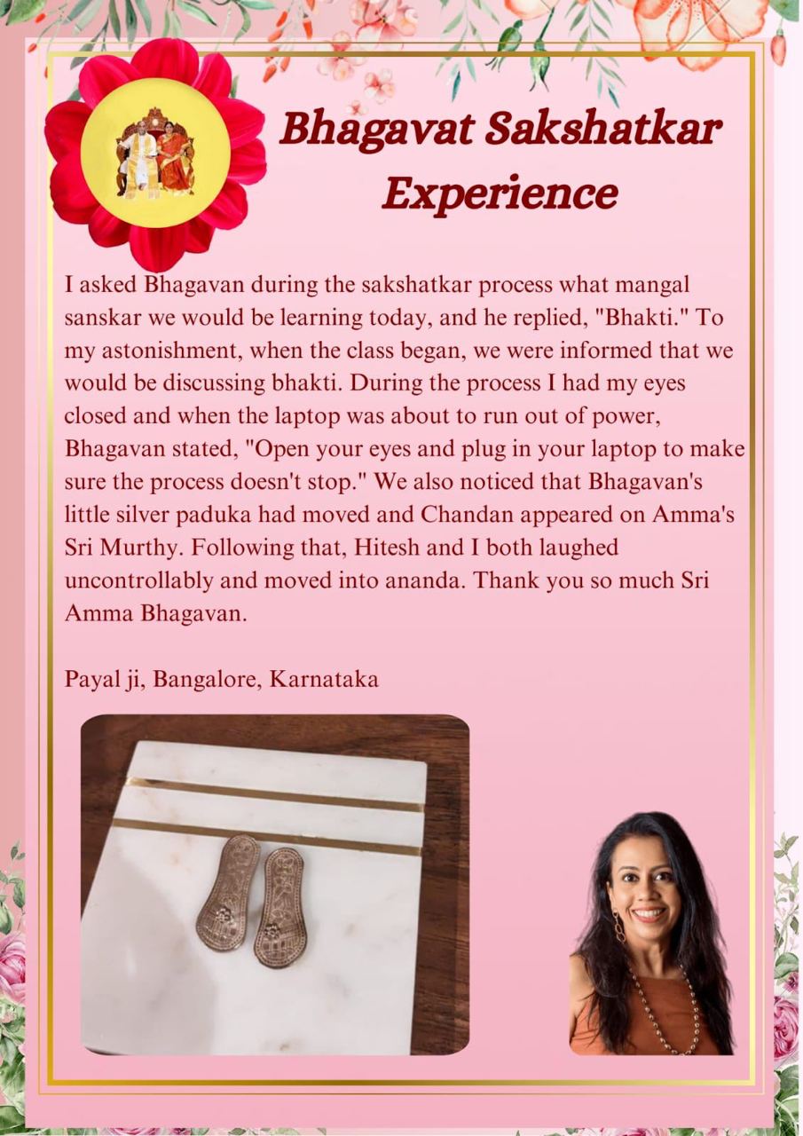 サクシャッカーラ・プロセスの時に、私がバガヴァンに今日はどのようなマンガル・サンスカール(幸運の儀式)を学ぶのですか、と尋ねると、バガヴァンは「バクティ」と答えました。