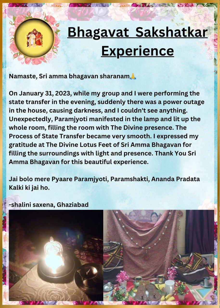 2023年1月31日に、私のグループと私は夕方にステイトの転送をしていると、突然、家が停電になり真っ暗で何も見えなくなりました。思いがけず、パラムジョッティがランプに現れ、部屋中を照らし、ディバインの臨在で満たされました。