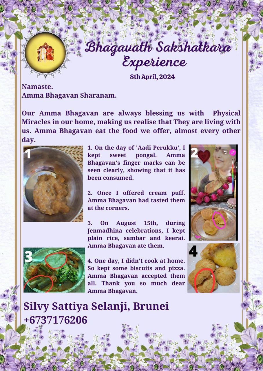 私たちのアンマバガヴァンは、いつも私たちの家で物理的な奇跡を祝福しお与えくださいます。そしてそれによって、アンマバガヴァンが私たちと共に生き暮らしてくださっているということを、実感させてくださいます。アンマバガヴァンは、ほぼ一日おきに、私たちがお供えする食べ物を食べてくださるのです。