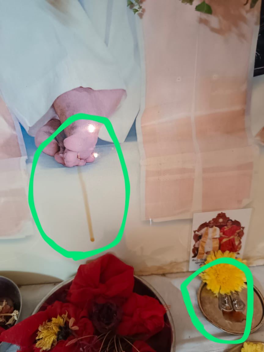 ムーラ マントラを詠唱している間に、シュリムルティとリトル パドゥカのシュリ アンマ バガヴァンの聖なる蓮華のお御足から ソーマが蜂蜜の形で流れ始めたのです。それは幻想的なほど素晴らしい奇跡でした。