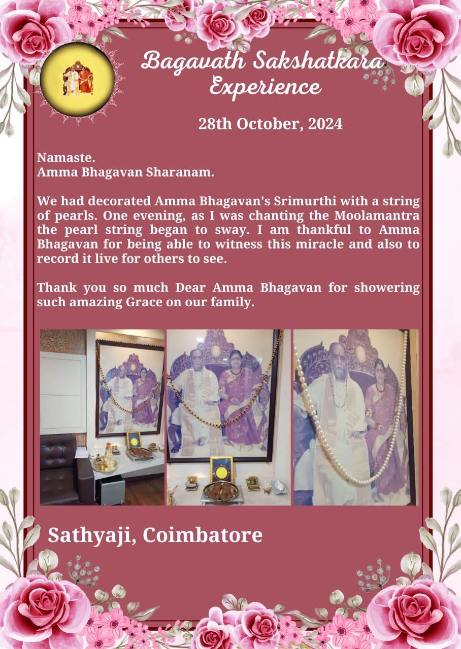 私たちはアンマ バガヴァンのシュリムルティを真珠の飾りひもで飾りました。ある晩、ムーラマントラを唱えていますと、その真珠の飾りひもが揺れ始めました。私はアンマバガヴァンに、このような奇跡を目の当たりにできたこと、そしてそれを他の人が見ることができるようにライブで録画できたことに、心から感謝しています。