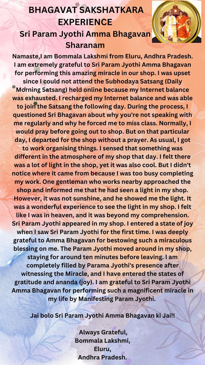 奇跡を目撃した後、私は完全にパラム ジョッティの存在に満たされ、感謝とアナンダ(悦び)の状態に入りました。パラム ジョッティを顕現させることによって、私の人生にこのような素晴らしい奇跡を起こしてくださいましたことを シュリ パラム ジョッティ アンマ バガヴァンにとても感謝しております。