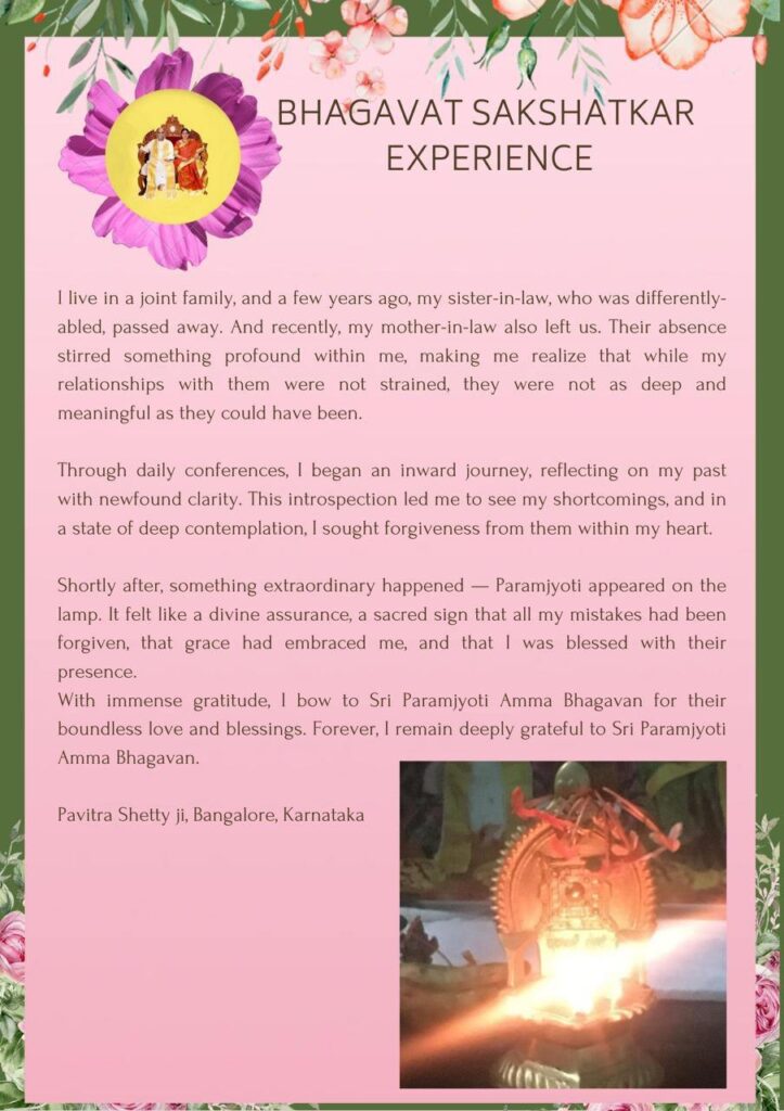 計り知れない感謝の気持ちを込めて、シュリ・パラムジョッティ・アンマ・バガヴァンの限りない愛と祝福に深々と平伏いたします。