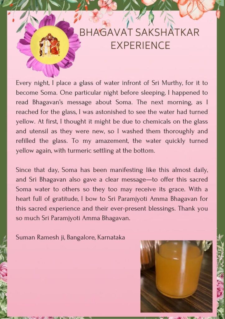 その日以来、ソーマはほとんど毎日このような形で顕現し、シュリ・バガヴァンは明確なメッセージもくださいました。ー 他の人たちにこの聖なるソーマ水を捧げると、彼らもまたその恩寵を受けることができるでしょう。心からの感謝と共に、この聖なる体験と彼らの絶え間なく存在する祝福をくださるシュリ・パラムジョッティ・アンマバガヴァンに敬意を表します。