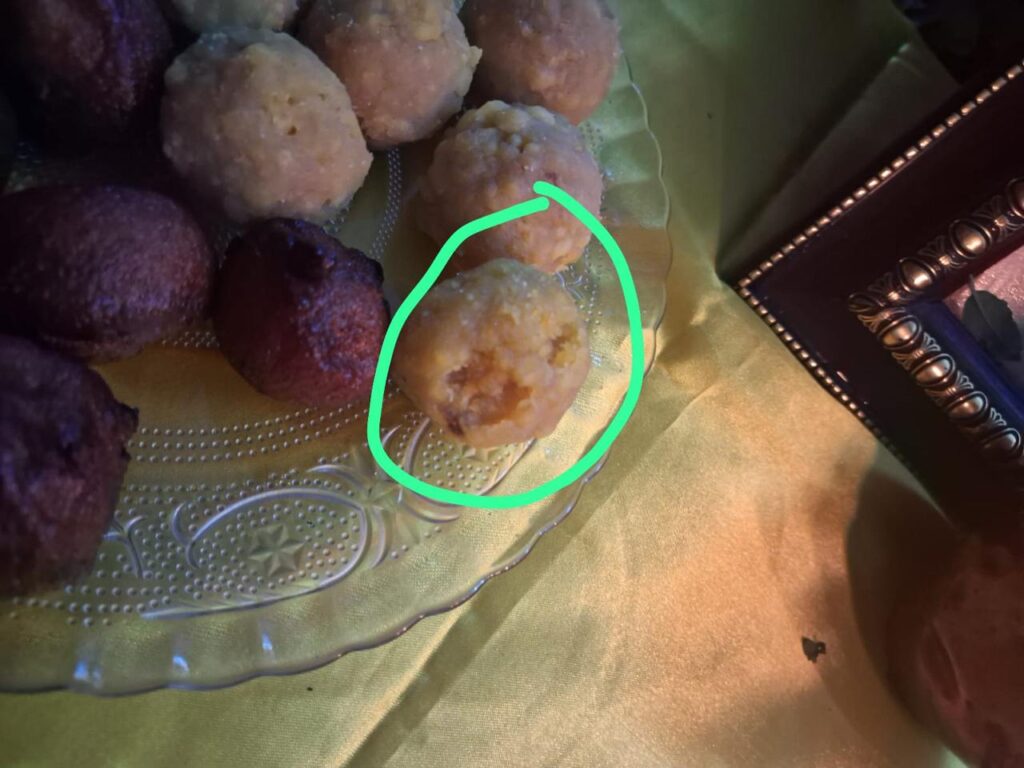 プージャーのためにラドゥー(小麦粉/ギー(バターオイル)と砂糖で作った丸いお菓子)やウニヤッパム(米、バナナ、数種類のスパイス、ココナッツで作る甘いスナック菓子)などのサヴォリー(美味しい食べ物)をご用意いたしました。