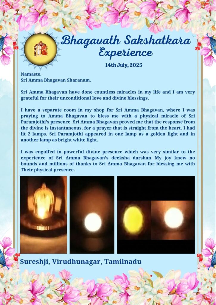 シュリ アンマ バガヴァンは、ハートからの一途な祈りに対するディヴァイン(聖なる存在)の応答は 瞬時であることを私に証明してくださいました。私は2つのランプに火を灯しました。すると、ひとつのランプには黄金の光として もうひとつのランプには明るい白い光として シュリ パラムジョッティがお姿を顕してくださったのです。