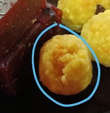 台所での用事を済ませ、夕方の灯りをともすためにプージャルームに戻った時、お供えしたラドゥに穴が空いているのを見て、驚きで固まってしまいました。