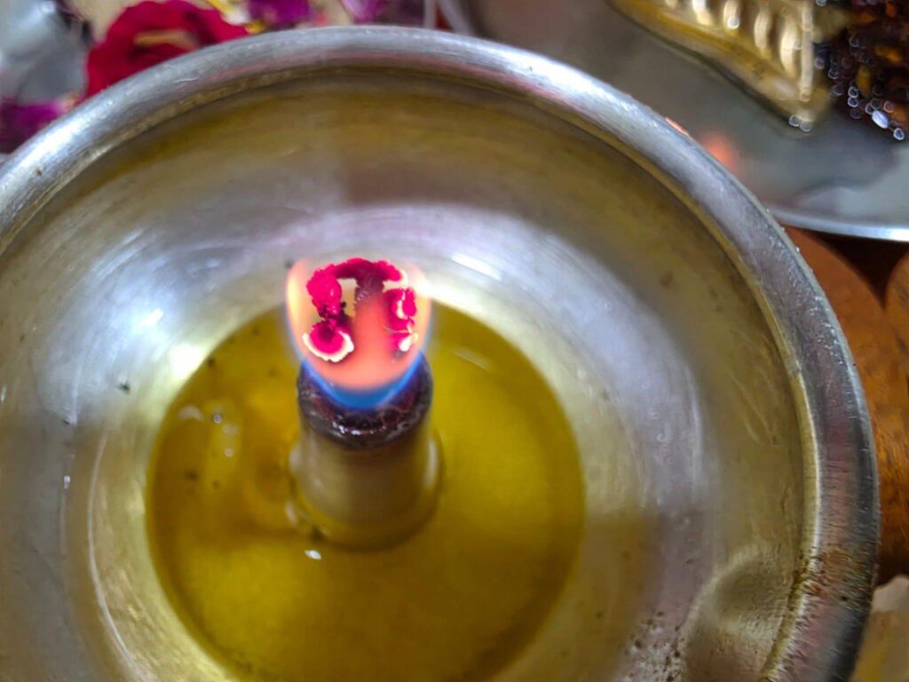 シュリ・アンマバガヴァンのご臨在が、シュリムルティのそばにあるディヤ(灯)の中に花の形で現れました。