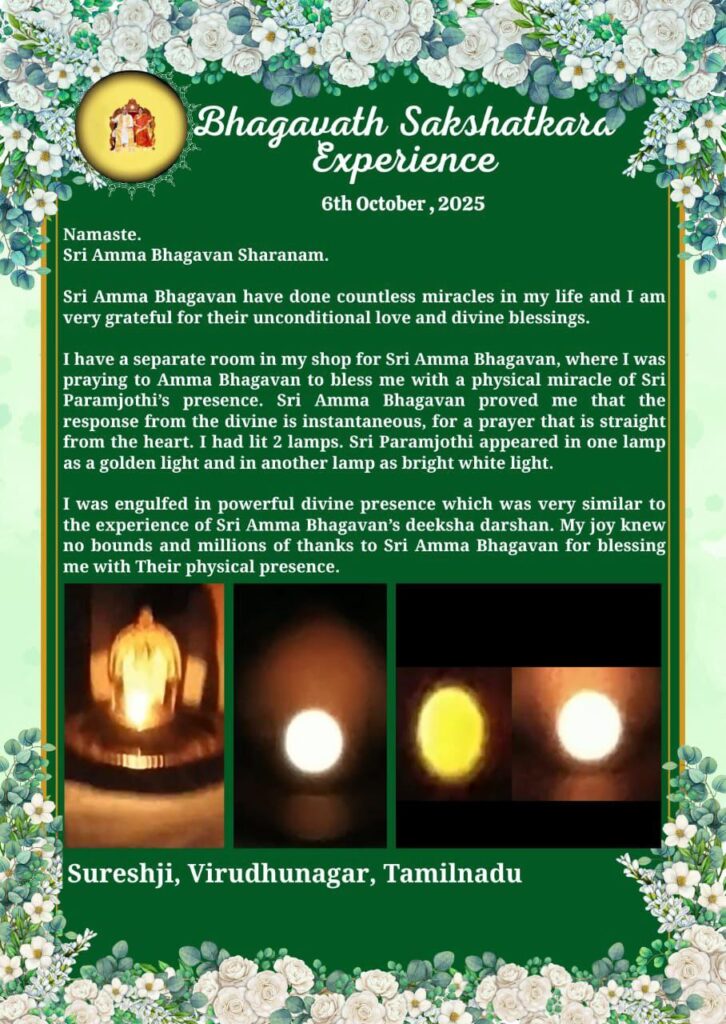 シュリ・アンマバガヴァンは、ハートからの祈りに対して、ディバインはすぐに応えてくれるということを示してくださいました。私は2つのランプを灯しました。シュリ・パラムジョッティは1つのランプに黄金の光として現れ、もう1つのほうには輝く白い光として現れてくださいました。