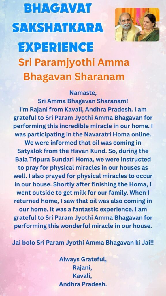 私達は、サティアローカから、ハヴァンクンド(火の祭壇)でオイルが湧き出ていると知らされました。そして、バラ・トリプラスンダリ・ホーマの間、私たちは自分たちの家で同様の物理的な奇跡をお祈りするよう言われました。私もまた、我が家で物理的な奇跡が起こるよう祈りました。ホーマが終わり少し経った頃、私は家族のためにミルクを採りに外に出ました。帰宅すると、私はオイルが我が家にも湧き出ているのを見つけました。それは幻想的な体験でした。
