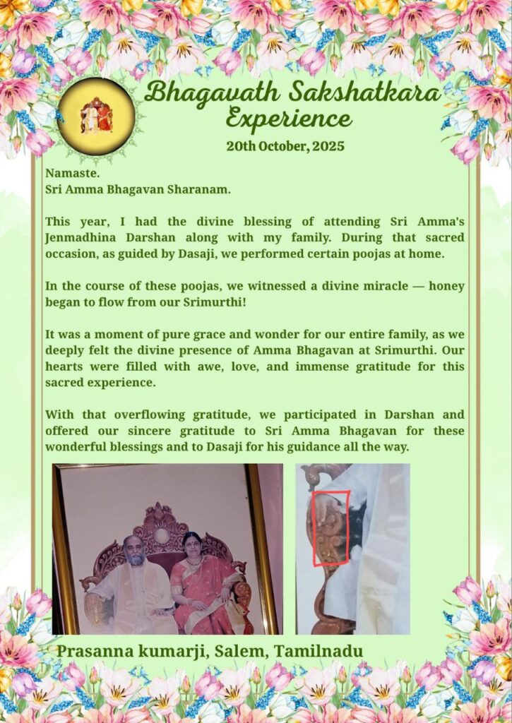 それは私たち家族全員にとって、純粋な恩寵と驚きの瞬間でした。なぜなら、私たちはシュリムルティにアンマ バガヴァンのディヴァイン プレゼンス(聖なる存在)を深く感じたからです。私たちのハートは、この神聖な体験への畏敬の念、愛、そして計り知れない感謝で満たされました。