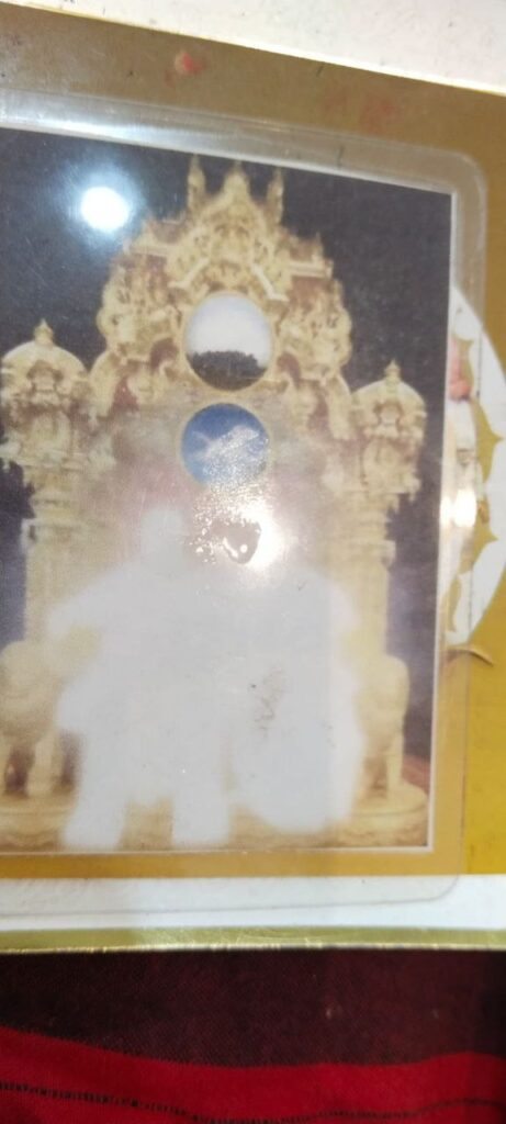 初め、私のマインドは私が目にしたものを疑い、それが現実であるはずがないと考えていました。けれども、その数滴の油が何時間も、そして何日ものあいだ消えずに残っていたとき、これは確かに物理的な顕現——シュリ・パラムジョッティ・アンマバガヴァンの臨在と祝福の疑う余地の無い証だと悟りました。この美しい祝福をお与え下さった、シュリ・パラムジョッティ・アンマバガヴァンに感謝申し上げます。