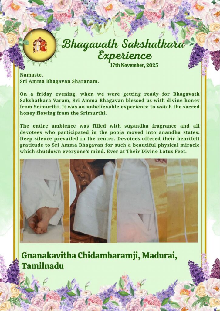 金曜日の夕方、私たちがバガヴァット サクシャッカーラ ヴァラム(ディヴァインの物理的な顕現の祝福)の準備をしていると、シュリ アンマ バガヴァンはシュリムルティから流れ出る神聖な蜂蜜で 私たちを祝福してくださいました。