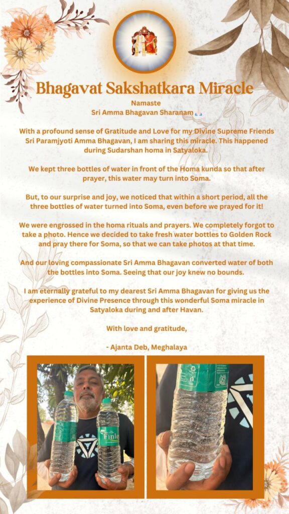 ホーマの最中、そしてその後もサティアローカにおいてこの素晴らしいソーマの奇跡を通じ神聖な臨在を体験させて下さった最愛なるシュリ・アンマバガヴァンに永遠の感謝を捧げます。