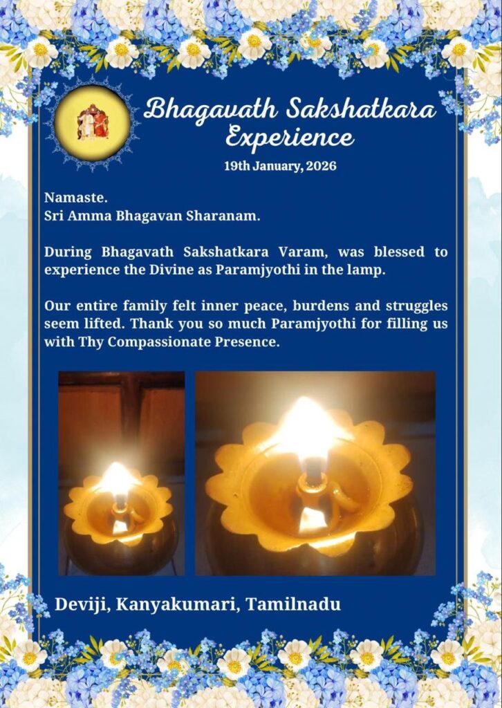 バガヴァト・サクシャッカーラ・ヴァラム(聖なる力の現実化の祝福の時間)において、ランプの灯りの中にパラムジョッティとして聖なるディヴァインを体験させていただくという祝福を受けました。