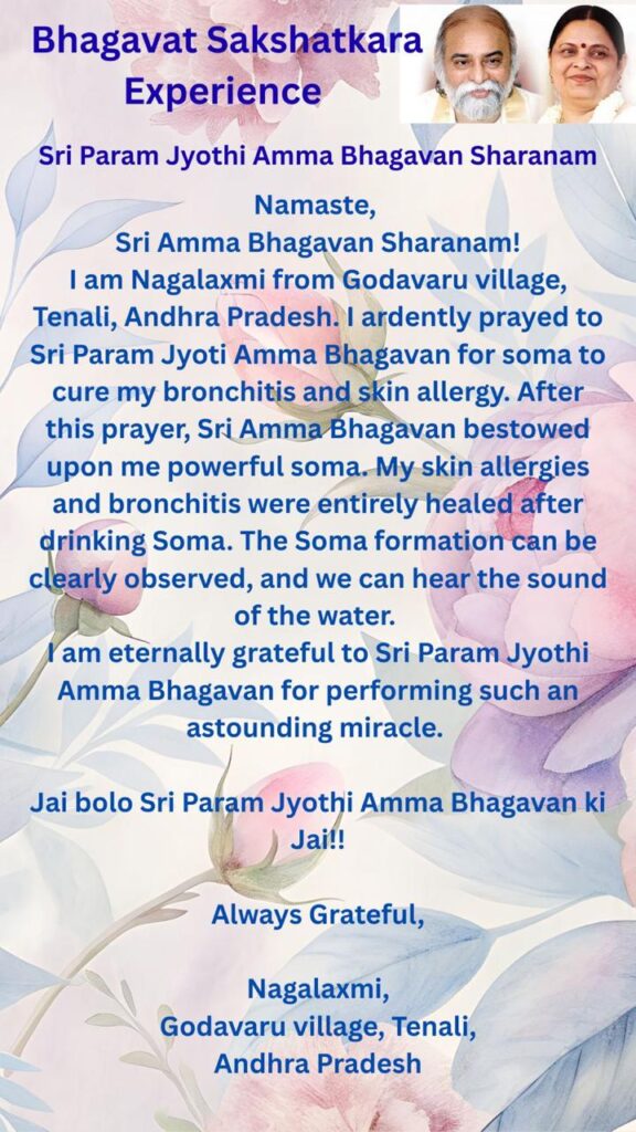 私は気管支炎と皮膚アレルギーを治していただけますようにと、シュリ・パラム・ジョッティ・アンマ・バガヴァンにソーマを熱心に祈願いたしました。