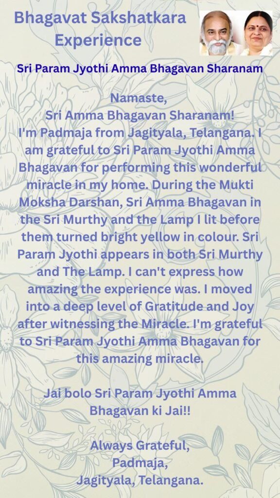 この驚くべき奇跡を授けてくださったシュリ・パラム・ジョッティ・アンマ・バガヴァンに感謝を捧げます。