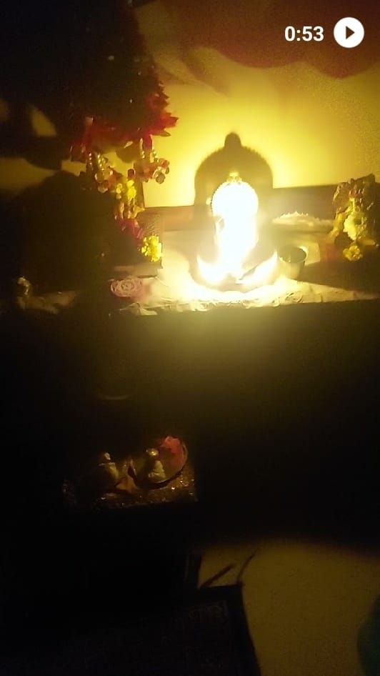 パラムジョッティ(至高の光)の灯明の写真を撮りましたところ、シュリ、・ムルティ(神像)のそばに置かれたランプの中に、シュリ・パラムジョッティ(至高の光)が顕現されたのです。
