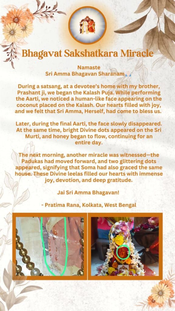 翌朝、さらにもう一つの奇跡を目の当たりにしました。パドゥカが前方へ動いており、2つのきらめく点が現れました。これはソーマもまた、同じ家を祝福してくださったことを示していました。これらの神聖な奇跡的な出来事は、私たちの心を計り知れない喜びと献身、そして深い感謝で満たしてくれました。