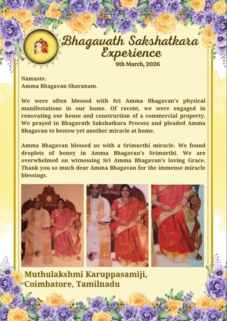 7月1日、バガヴァット・サクシャッカーラ・プロセスではお祈りを捧げ、アンマ・バガヴァンに自宅でのさらなる奇跡を授けてくださいますよう懇願いたしました。
