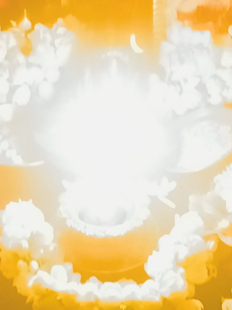 シュリ パラム ジョッティが シュリムルティの前に置かれたランプの中に顕現なさいました。それは信じられないような奇跡でした。シュリ パラムジョッティが顕れたとき、その空間全体がものすごい黄金の光で満たされていました。