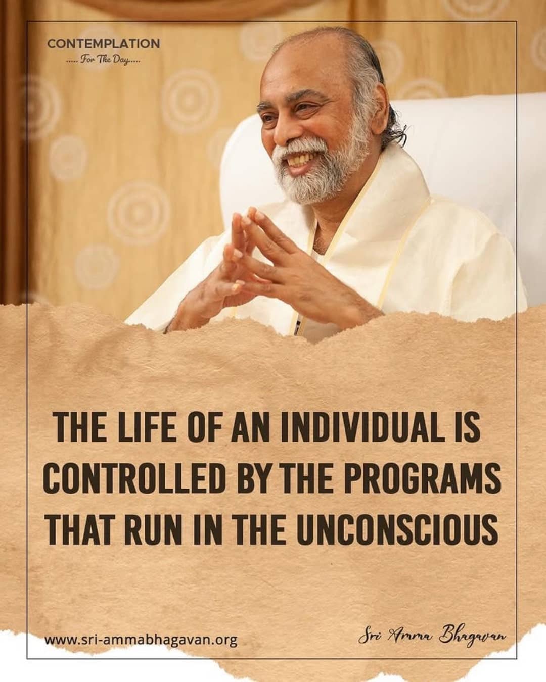 Top > シュリ・アンマ・バガヴァンによる教え > 今日の黙想 > 個人の人生は、無意識の中に走るプログラムによりコントロールされています。 2025年9月24日 2025年9月27日 2025/9/24 今日の黙想 個人の人生は、無意識の中に走るプログラムによりコントロールされています。 シュリ アンマ バガヴァン CONTEMPLATIONFor The Day The life of an individual iscontrolled by the programs thatrun in the unconscious Sri Amma Bhagavan Post Share LINE URLコピー -今日の黙想 -プログラム, 人生